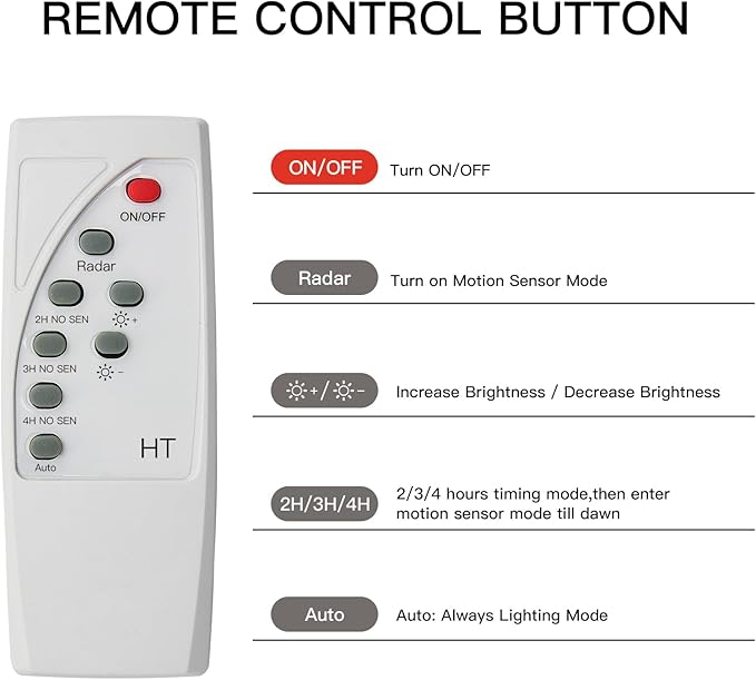 - Motion Sensor: When a person is detected, the brightness is 100%, and 10 seconds after the person leaves, the brightness is automatically adjusted to 30%. If someone enters your porch or house, they light up and give a warning by lighting up.
