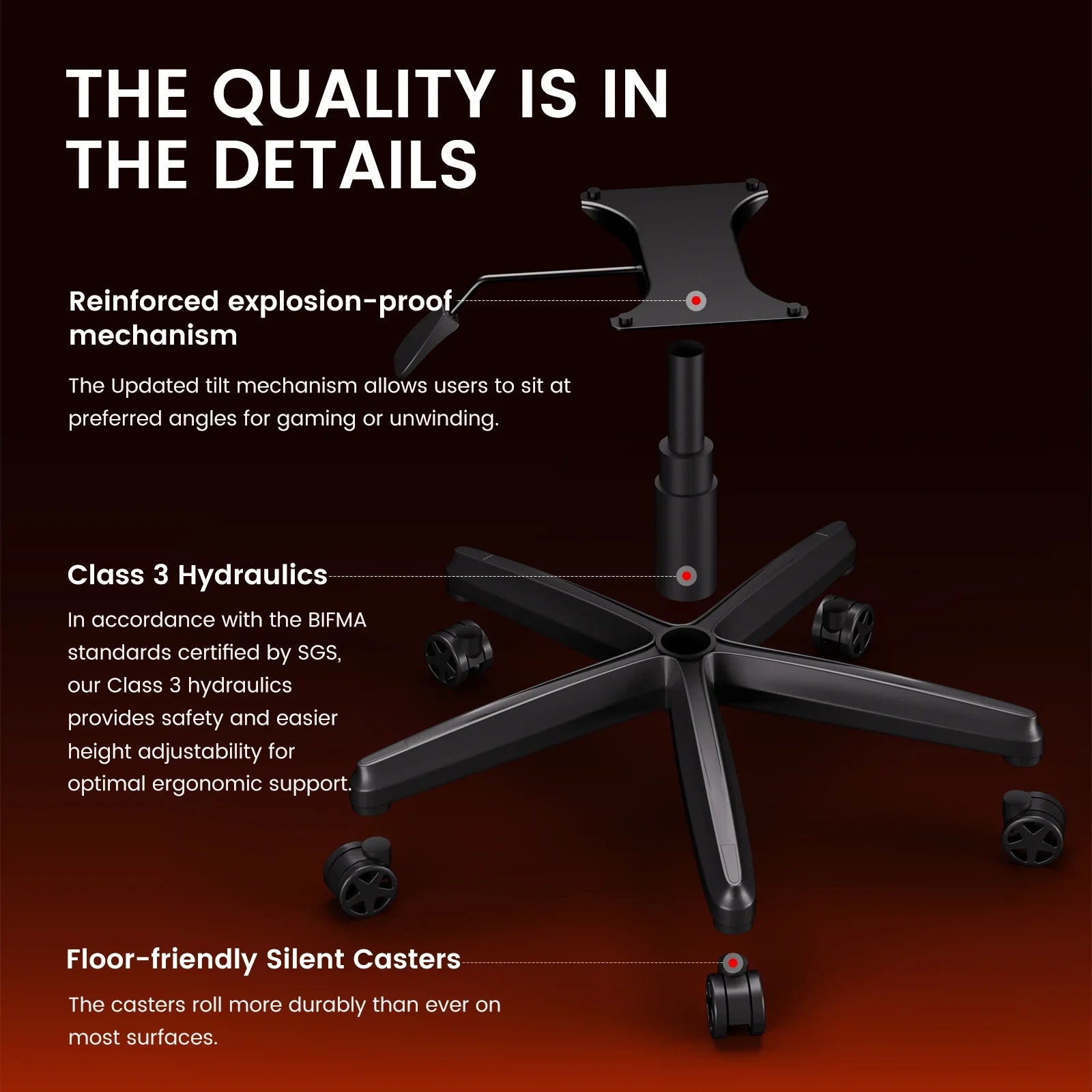 In accordance with the BlFMA standards certified by SeS, our Class 3 hydraulics provides safety and easier height adjustability for optimal ergonomic support.