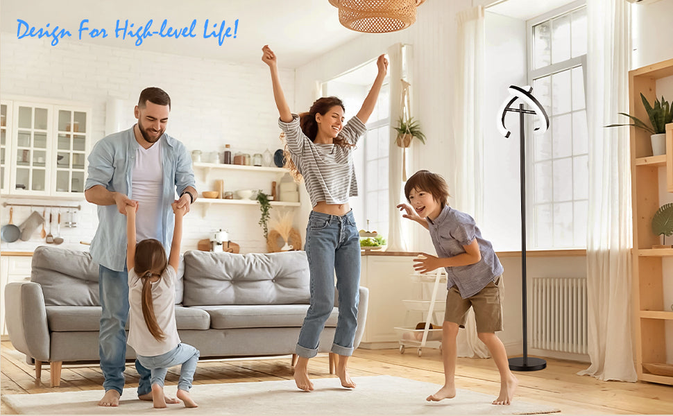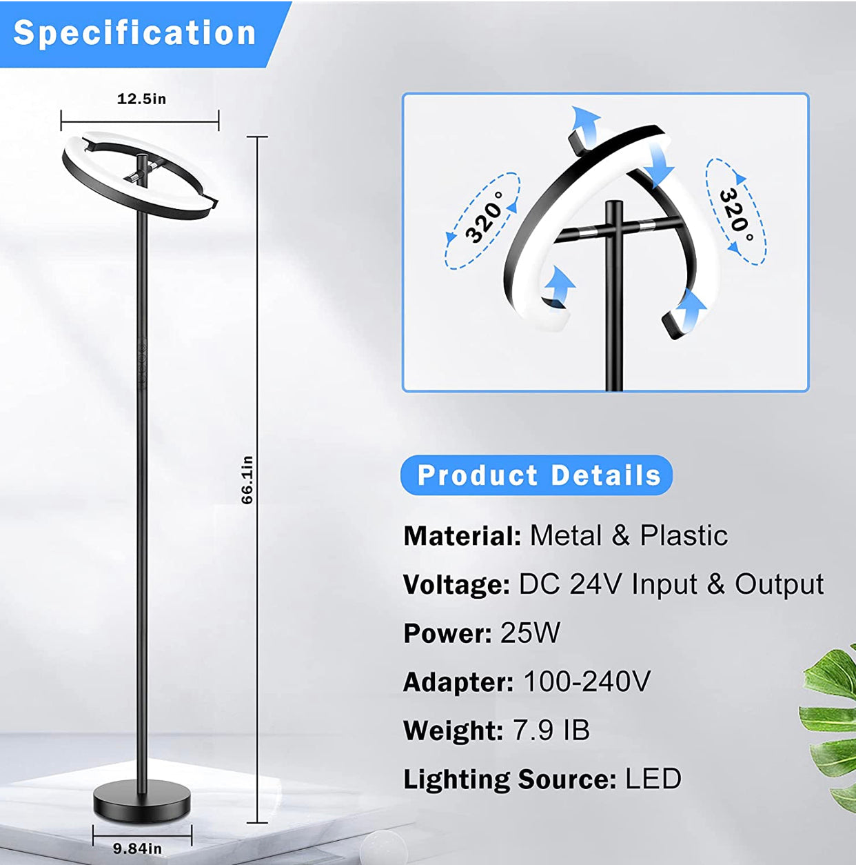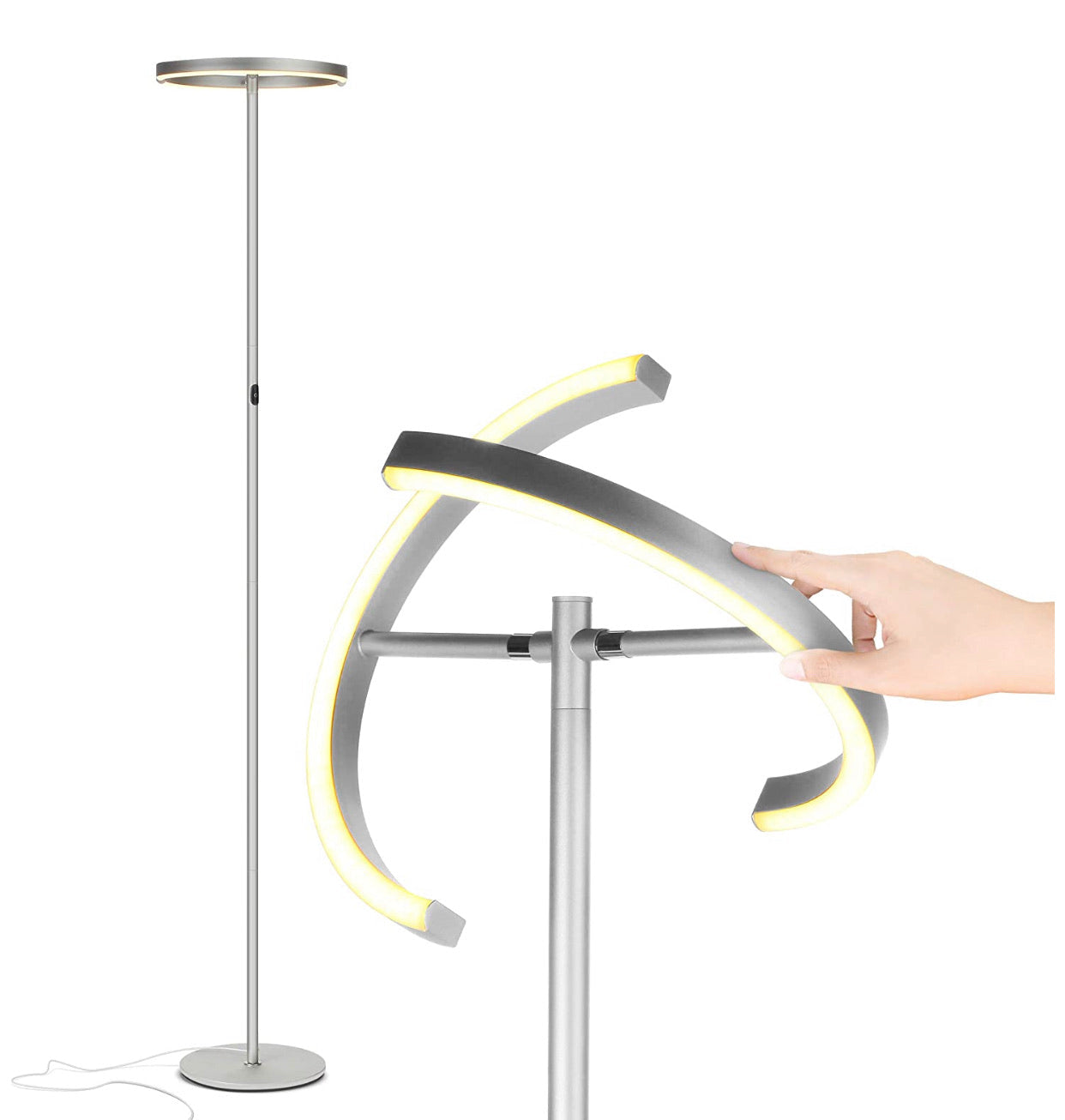 It puts out 30 watts, has a color temperature of 3000k, and 1489 lumens. It is approximately 67 inches tall with the head pieces angled horizontally, but you can angle them up to a vertical point at 72 inches tall. The head measures just under a foot wide, while the base measures 10 inches across. There are three different brightness settings to choose from, all controlled by simple taps of the power button.