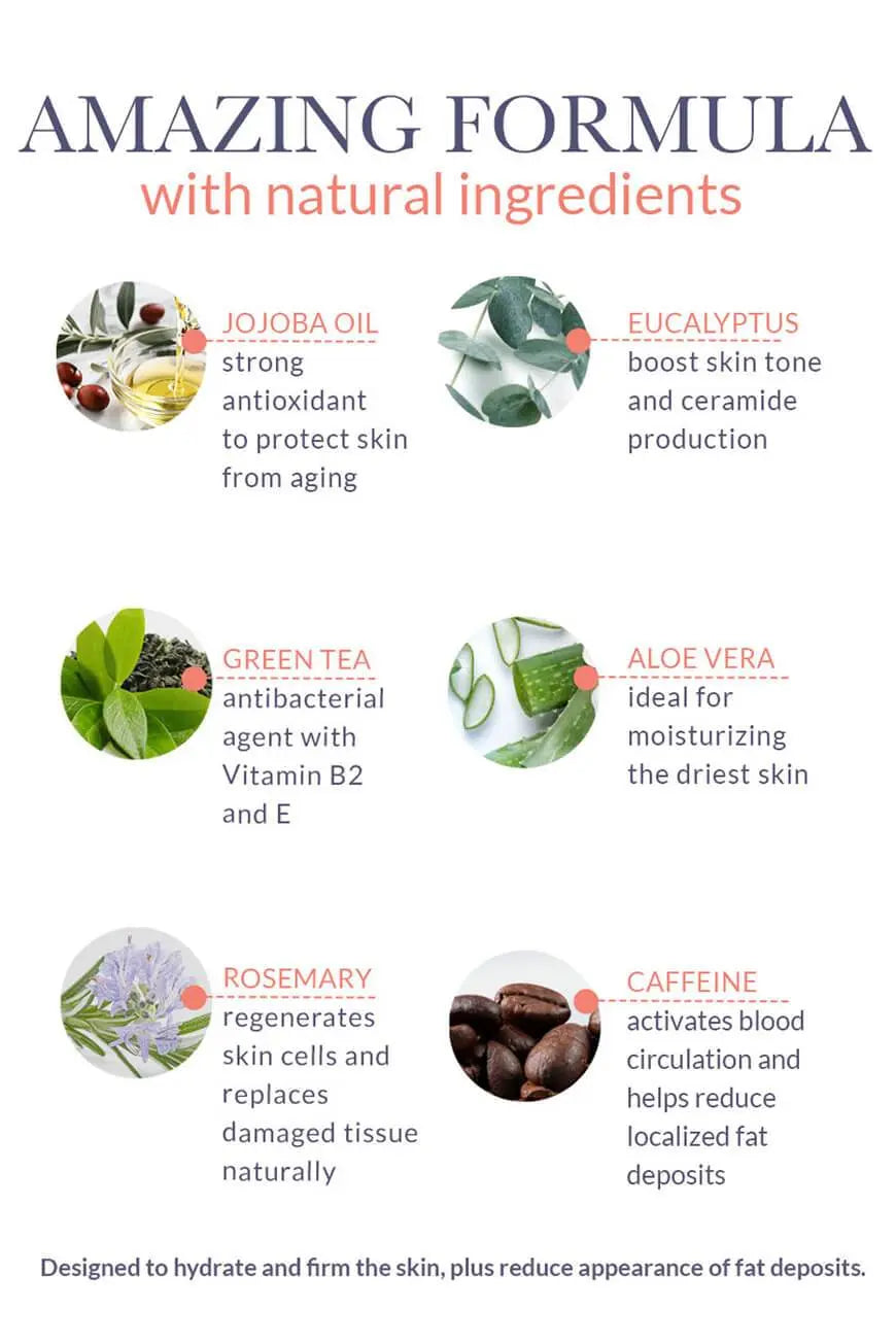Our Gel is infused with natural ingredients and penetrates deep into your skin for maximum effectiveness. Regular use boosts circulation and reduces the appearance of cellulite bumps, giving you the confidence to show off your beautiful curves.