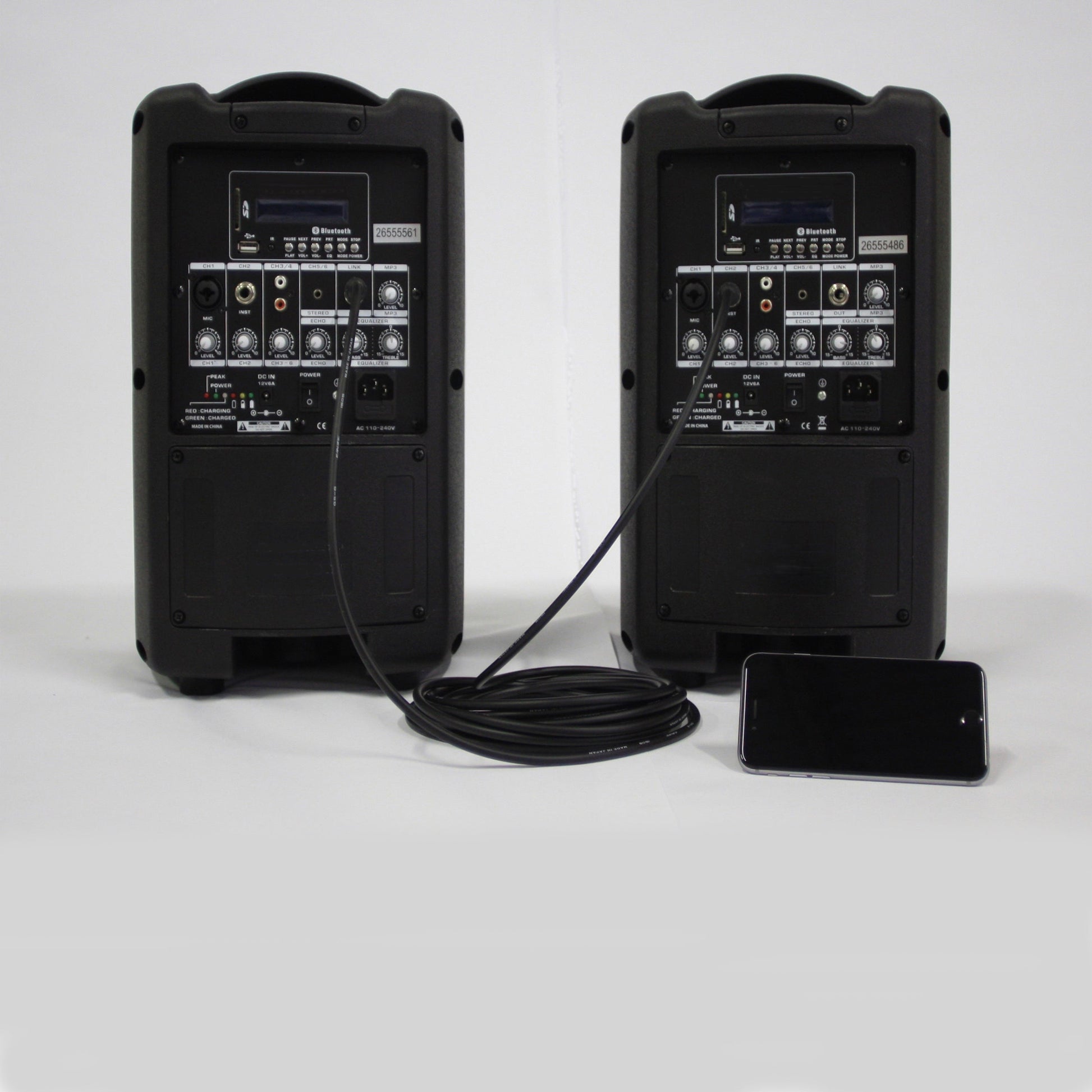The 12 inch speakers are smaller but still pack a punch for large audiences. Recommended for crowds of 100 or more. Speakers last 4 hours on a full charge.