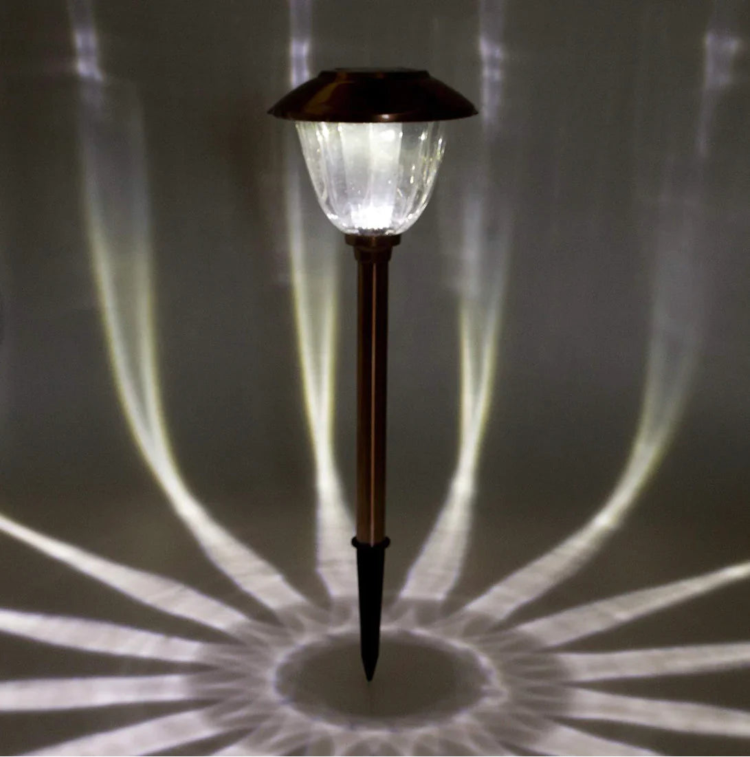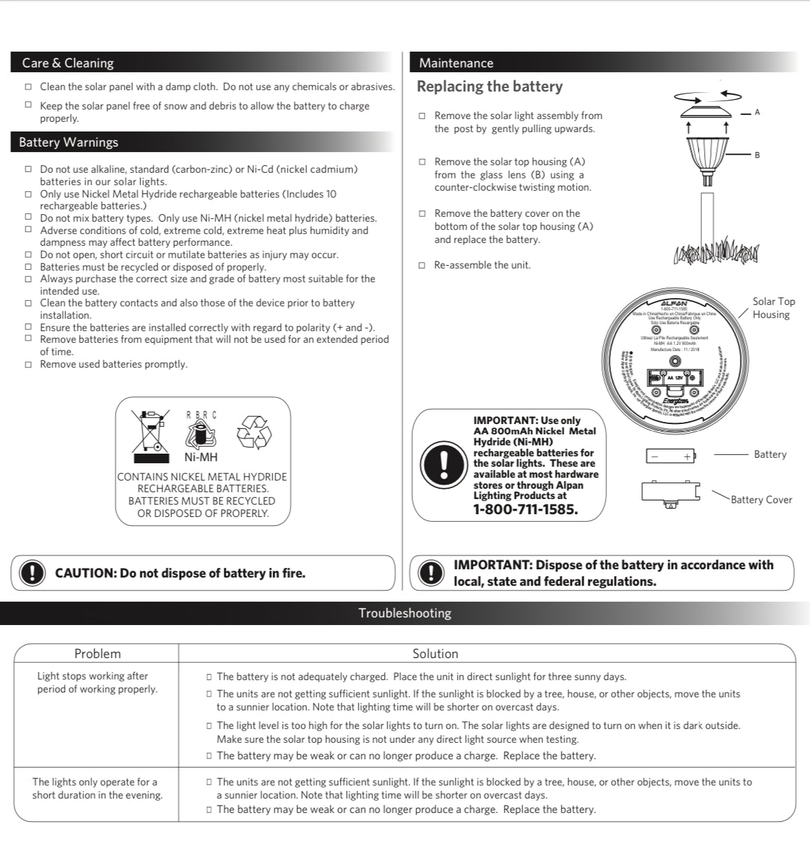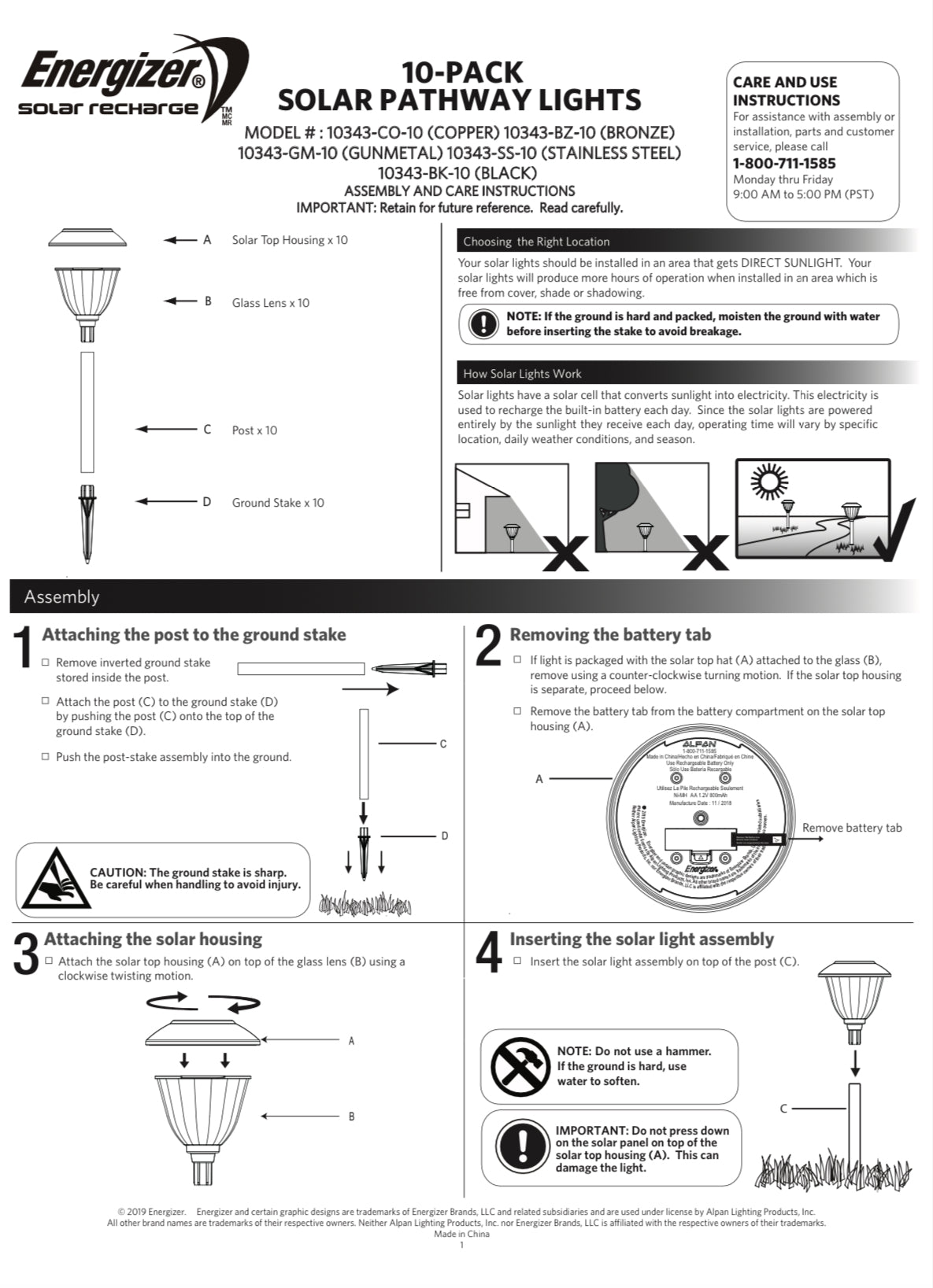•10 pack includes: 10 stake lights, batteries, and ground stake, each with a pre-installed rechargeable Energizer AA NiMH battery•Glass lens with crystal panel•No wiring or electricity required•Stainless steel construction•Some SIMPLE assembly required•For outdoor use only•Waterproof•Measurements: Light 15-1/2"H x 6-1/4"Diam; Stake 5"•Imported
