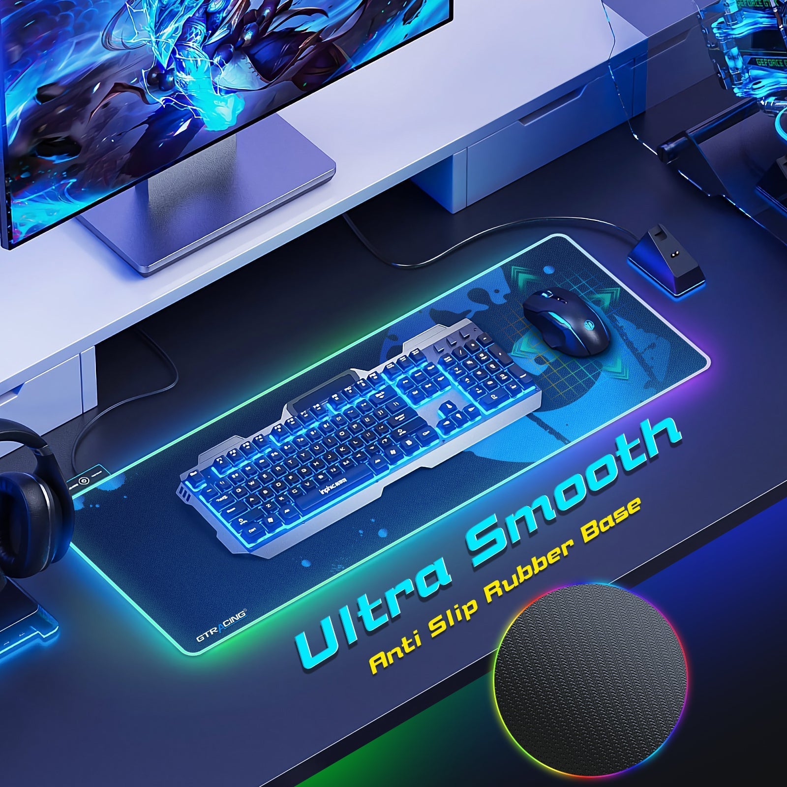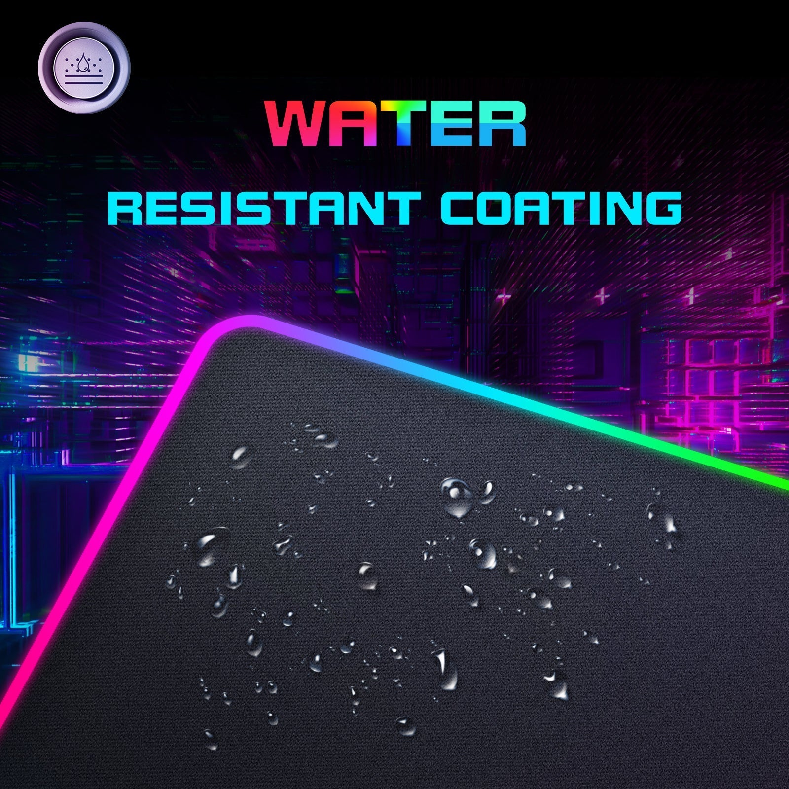 - Water-Resistant Coating: Our RGB mouse pad has special micro-textured cloth surface and the waterproof coating, which could effectively prevent damage from spilled drinks or other accidents. It’s easy to wipe and clean. Anti Slip Rubber Base: Anti slip texture bottom pad can firmly fix the large mouse pad in place. Our gaming mouse pad could stick firmly on your desk even during the most intense gaming session, bringing you the best gaming experience.