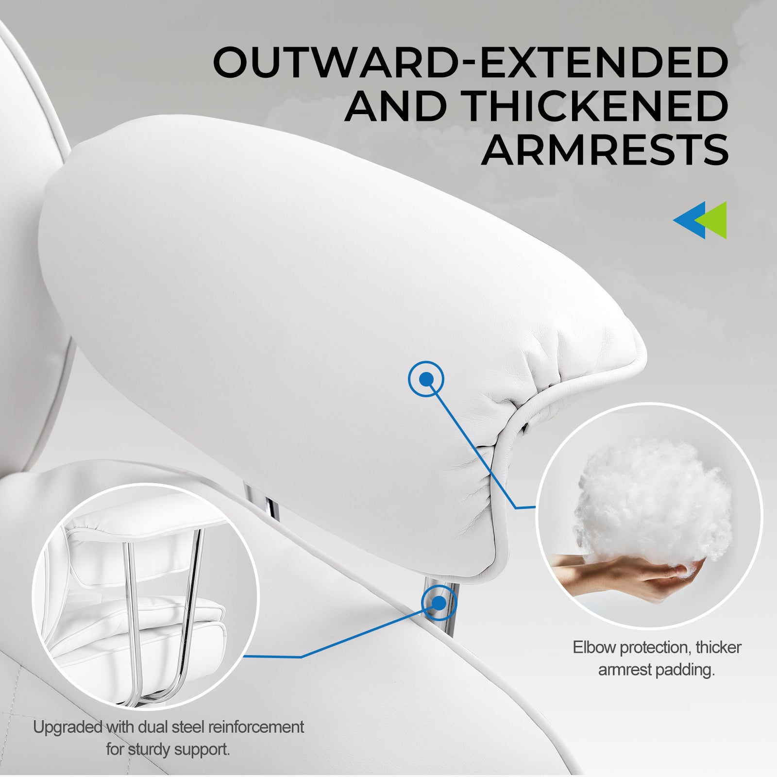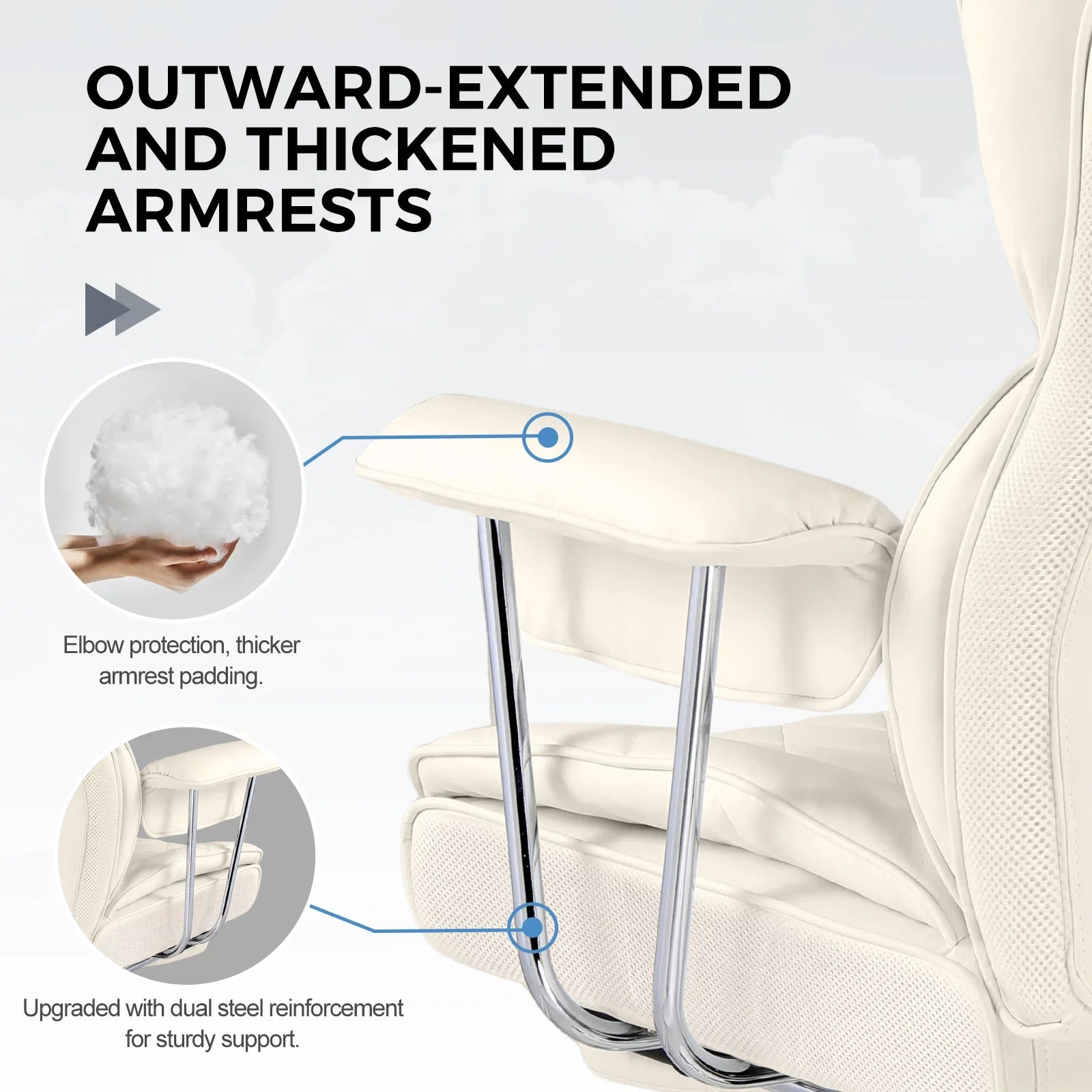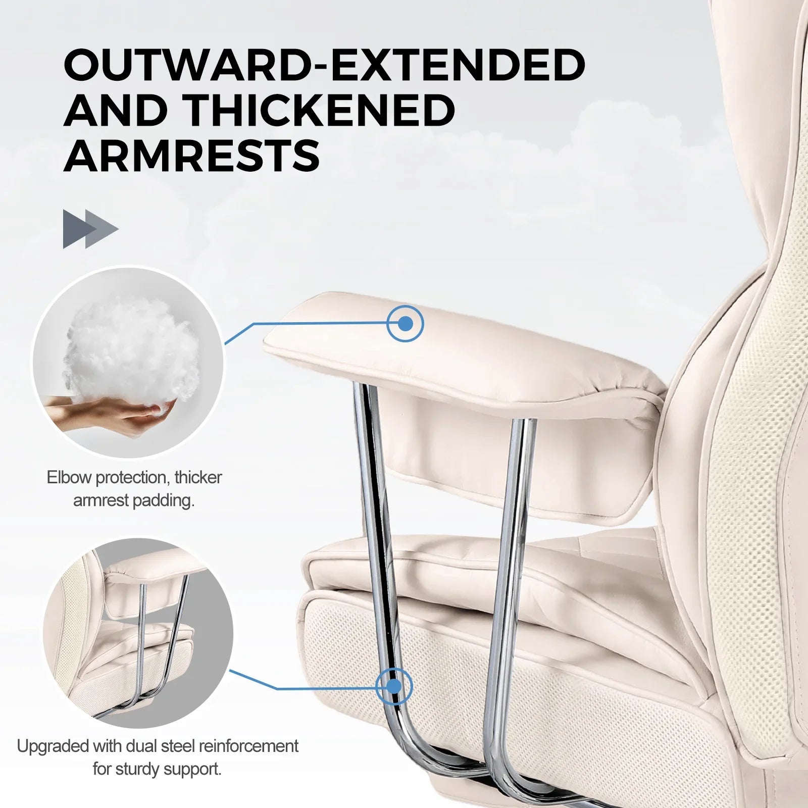 Upgraded dual steel reinforcement provides stable support, protecting the elbows, while the thickened padding on the armrests relaxes arm muscles, offering comfortable elbow support.