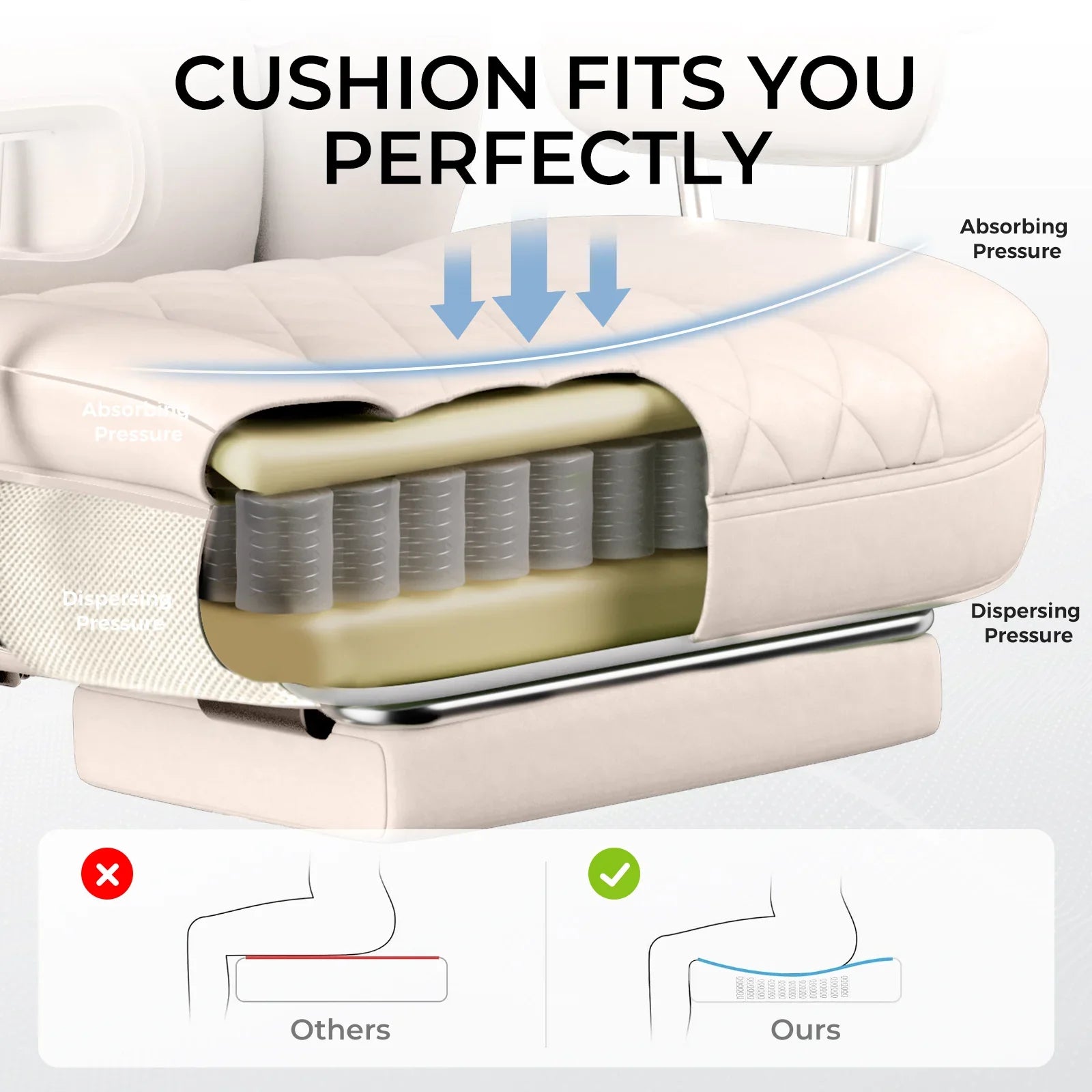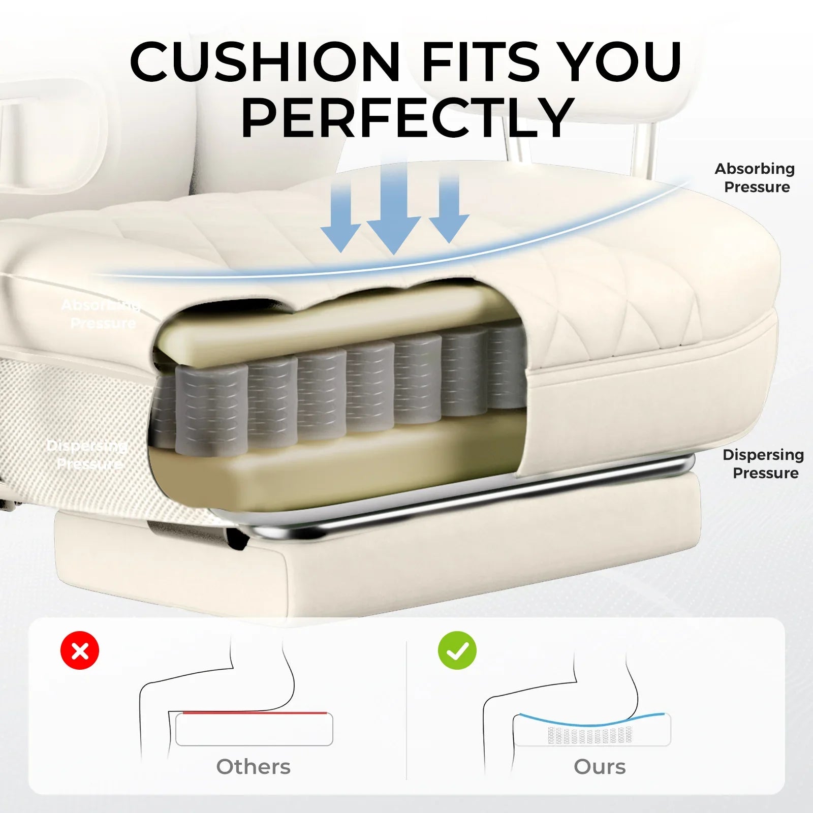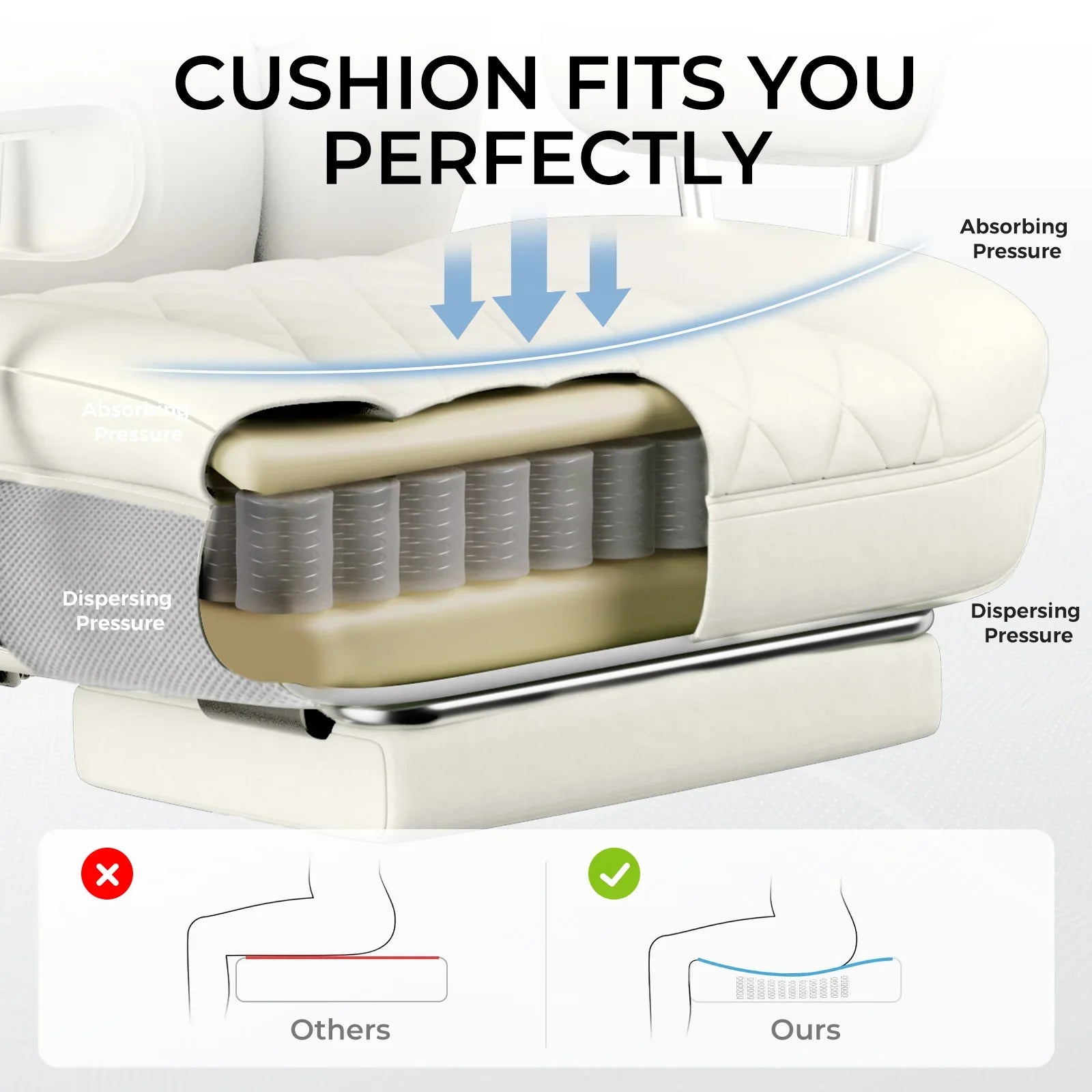 In order to increase the actual seating area and reduce the pressure of the wings on the thighs, we specifically designed the seat cushion of this series of gaming chairs to be a flat seat cushion.