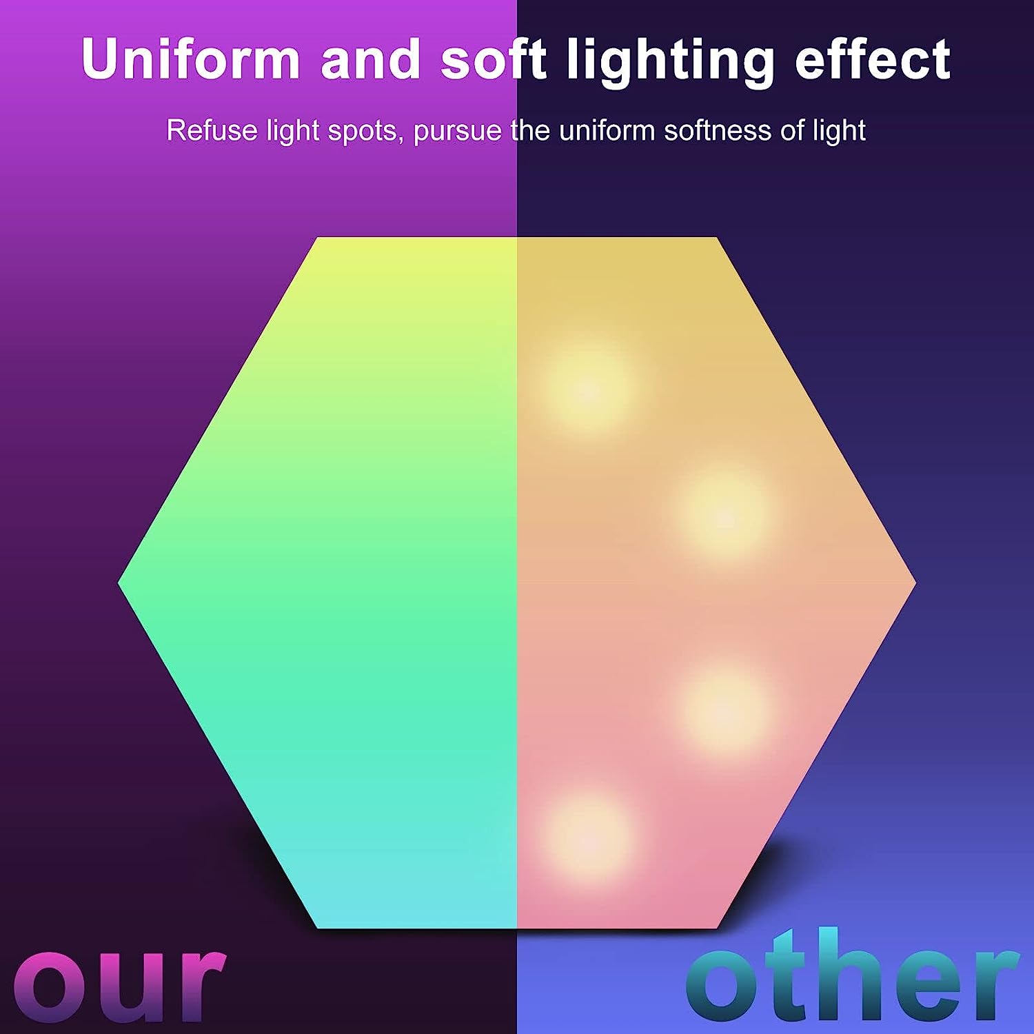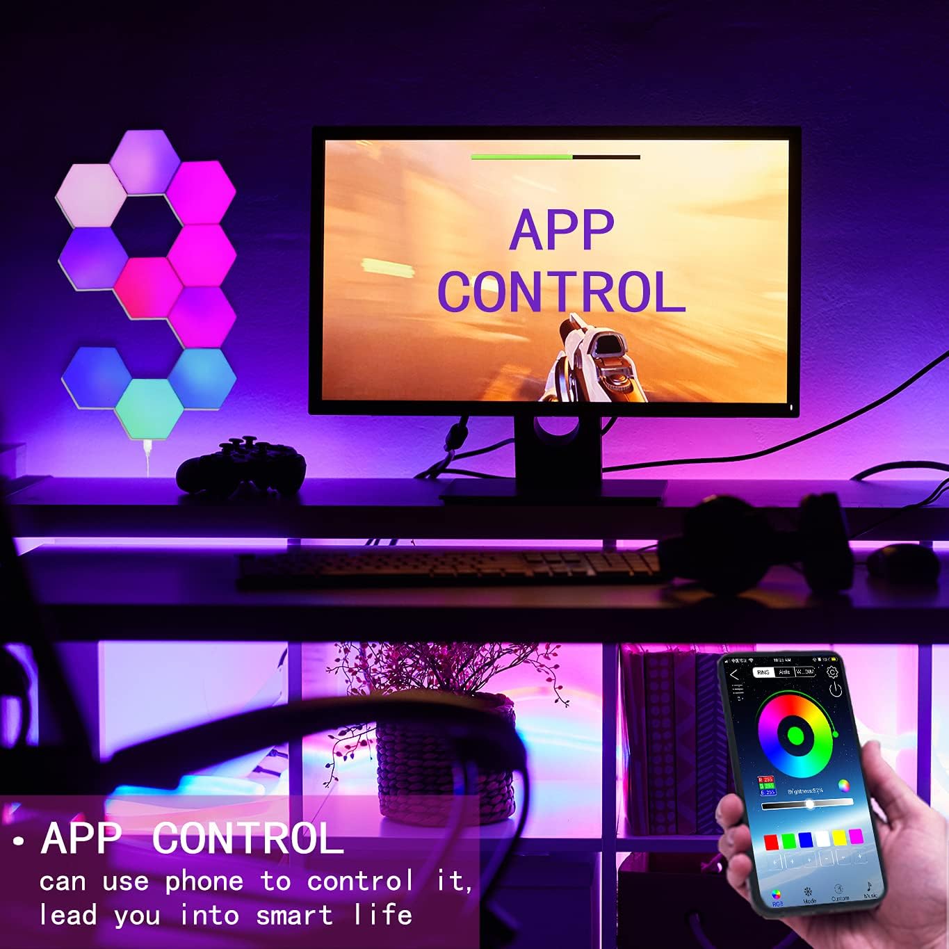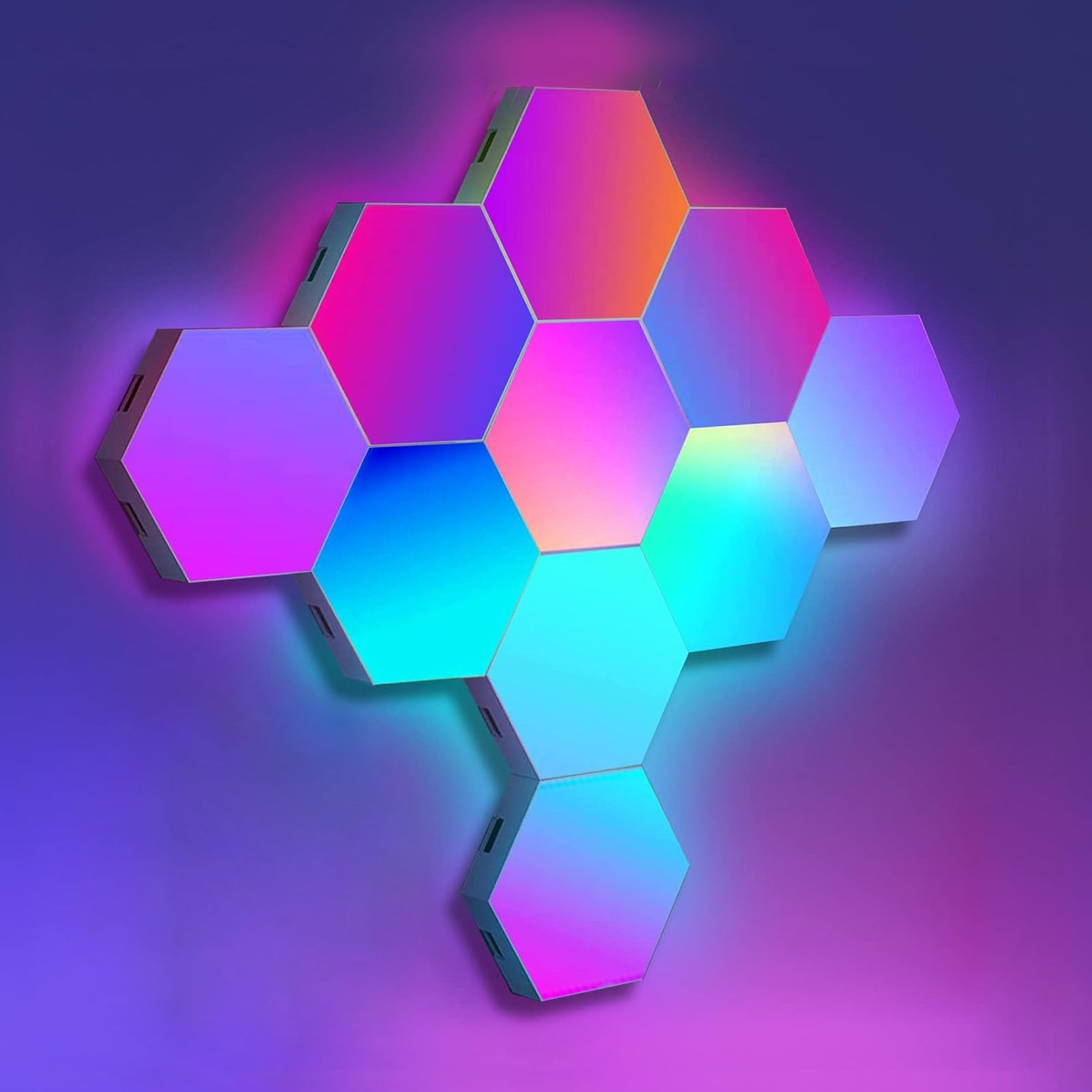 - DIY Smart LED Light Wall Panels Kit:Including 10 light hexagon shape panel blocks, the pattern can be spliced at will, displaying 16 million colors with several different modes, building fashion and romantic atmosphere in bedroom, living room and so many other scenes. Let your imagination run wild, coming up with different designs on a even wall or table.