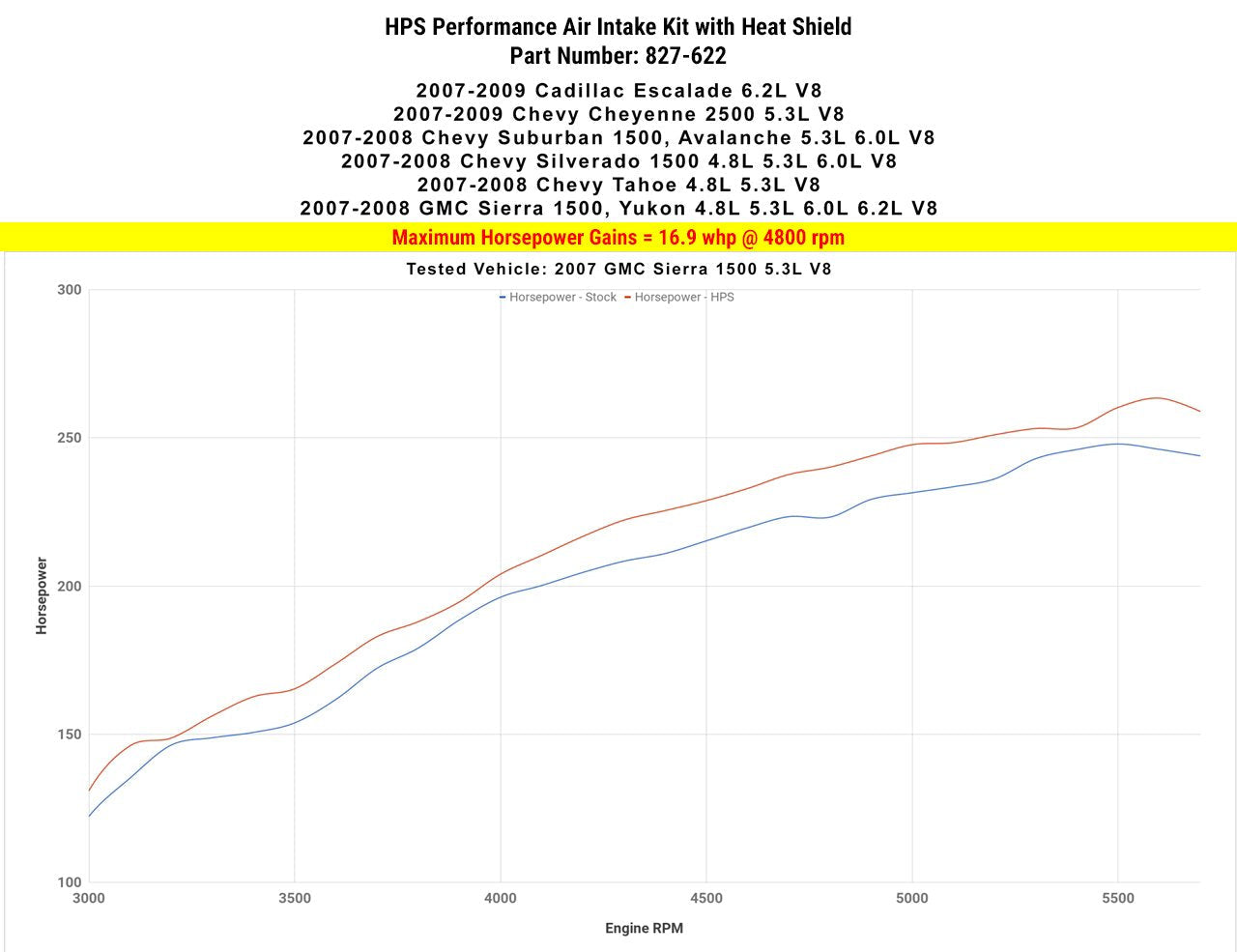 The All-New HPS Performance 827 Series Air Intake Kit (Polish, Part # 827-622P) for 2007-2008 GMC Sierra 1500 4.8L 5.3L 6.0L 6.2L V8 offers a free-flowing 4 inch mandrel-bent aluminum tube induction system designed to produce dyno proven performance gains - increase horsepower +16.9 whp , torque +18.5 ft/lbs and improve throttle response while maintaining safe air fuel ratio. The heavy duty powder coated steel heat shield blocks hot air from the air filter for the best cooling effect. The included installation manual has clear pictures and instructions to guide the installer throughout the whole process. The kit does NOT require tuning and does not trigger CEL light. No modification is required during the installation. HPS light weight mandrel-bent aluminum alloy tube replaces the stock restrictive air box and optimizes the airflow with excellent heat dissipation and long lasting durability. HPS Performance 827 Series air intake kit features race proven reinforced silicone hoses and industrial grade 100% stainless steel T-bolt clamps which ensures reliability, even during the most extreme driving conditions. The All-New HPS Performance Air Filter is designed with performance in mind, delivering excellent filtration without sacrificing airflow. All HPS Performance Air Filters are made in the United States.