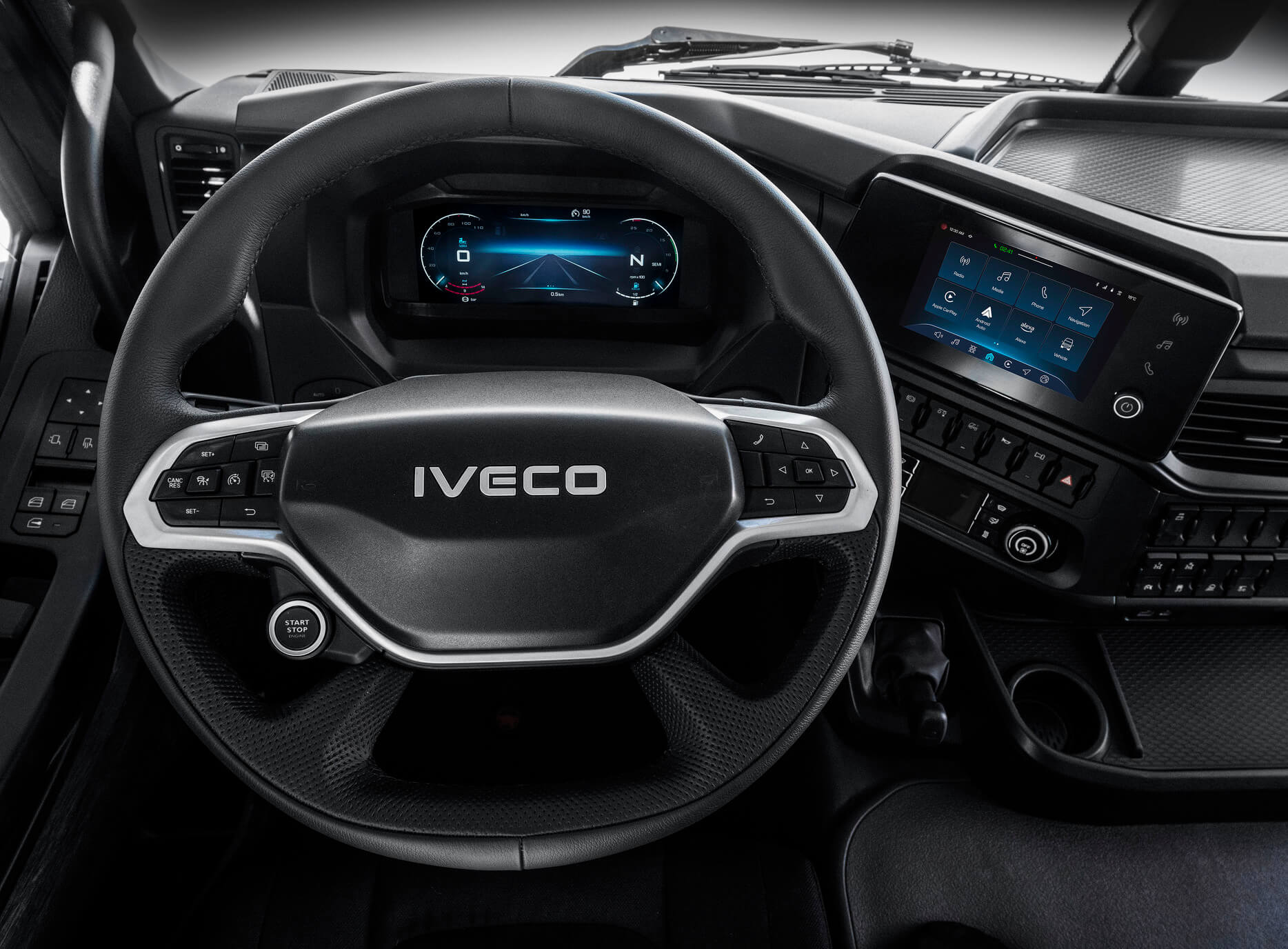 The new IVECO logo is available in chrome or matt gun metal finishes. There are eight grille options to choose from. These include glossy finishes, metallic elements or even body-coloured allowing operators to adapt their IVECO S-Way to mirror their corporate branding. The new mirrorless camera allows for a better visibility for the driver and improves aerodynamics aiding fuel economy. The front face includes headlamps with LED daytime running lights as standard, LED headlamps available, radar for ADAS functions, steps and grab handles to access the windscreen and side air deflectors designed to keep the door and mirrors clear even in adverse weather conditions. The bumper offers a choice of plastic and hybrid solutions with a choice of colours to match the requirements of your specific mission.
