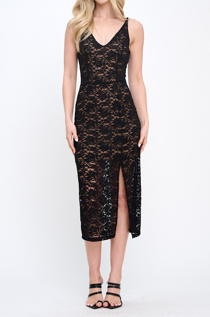 Made in USA Lace Fully Lined V neck Midi Dress with Slit. Available in other Colors. Fabric content: 90% Nylon, 10% Spandex.