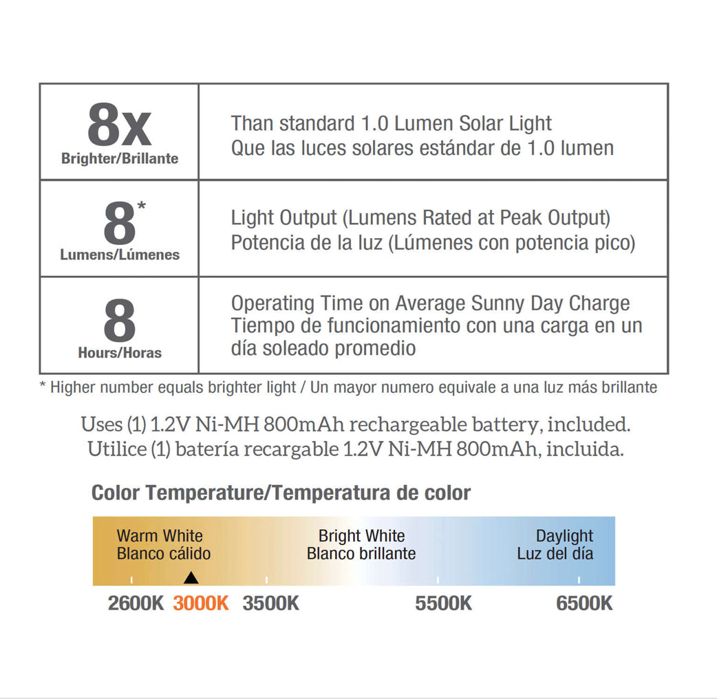 Illuminate your outdoor areas with this solar path light. Runs up to 8 hours of nightly runtime on a fully charge battery. No wiring required for easy set-up.