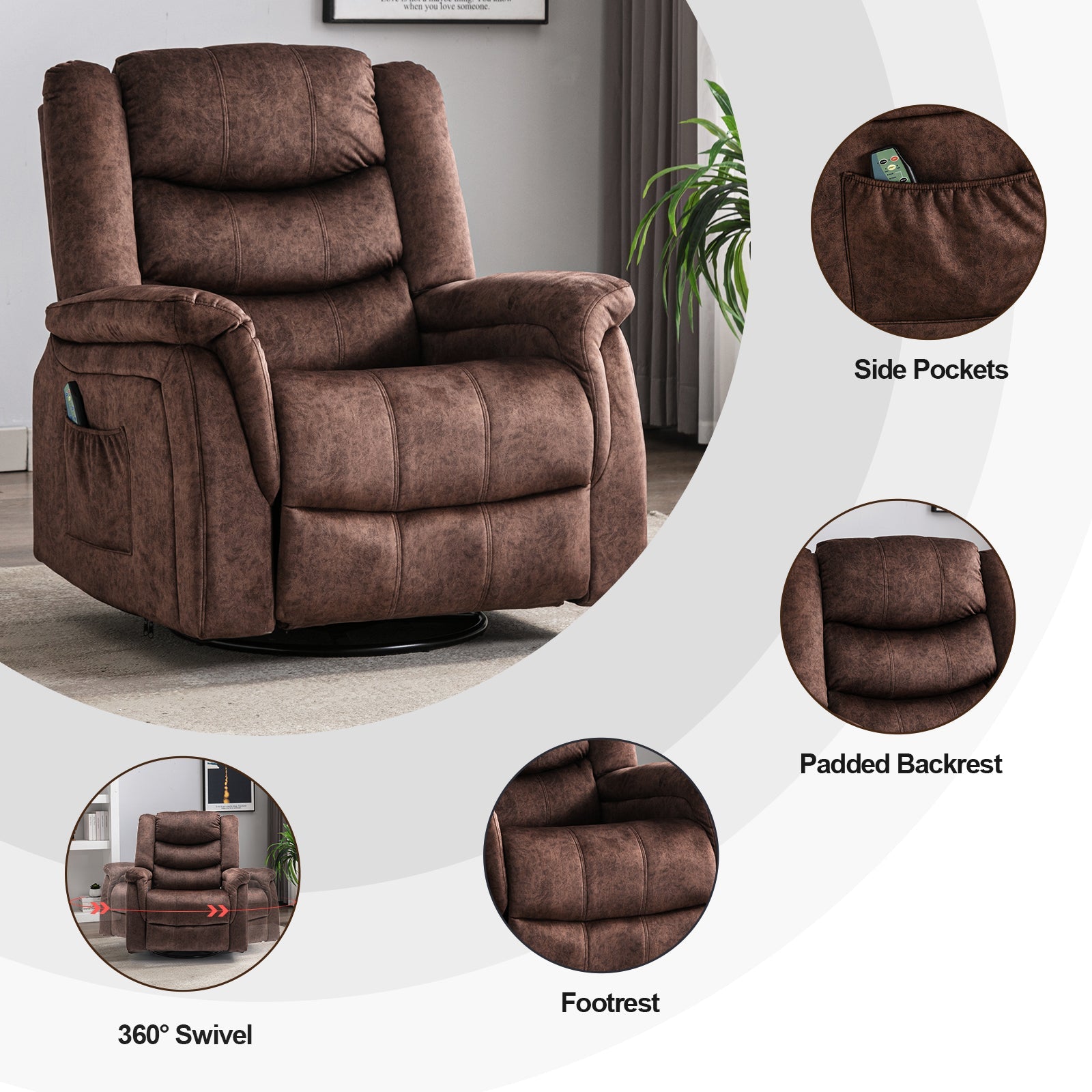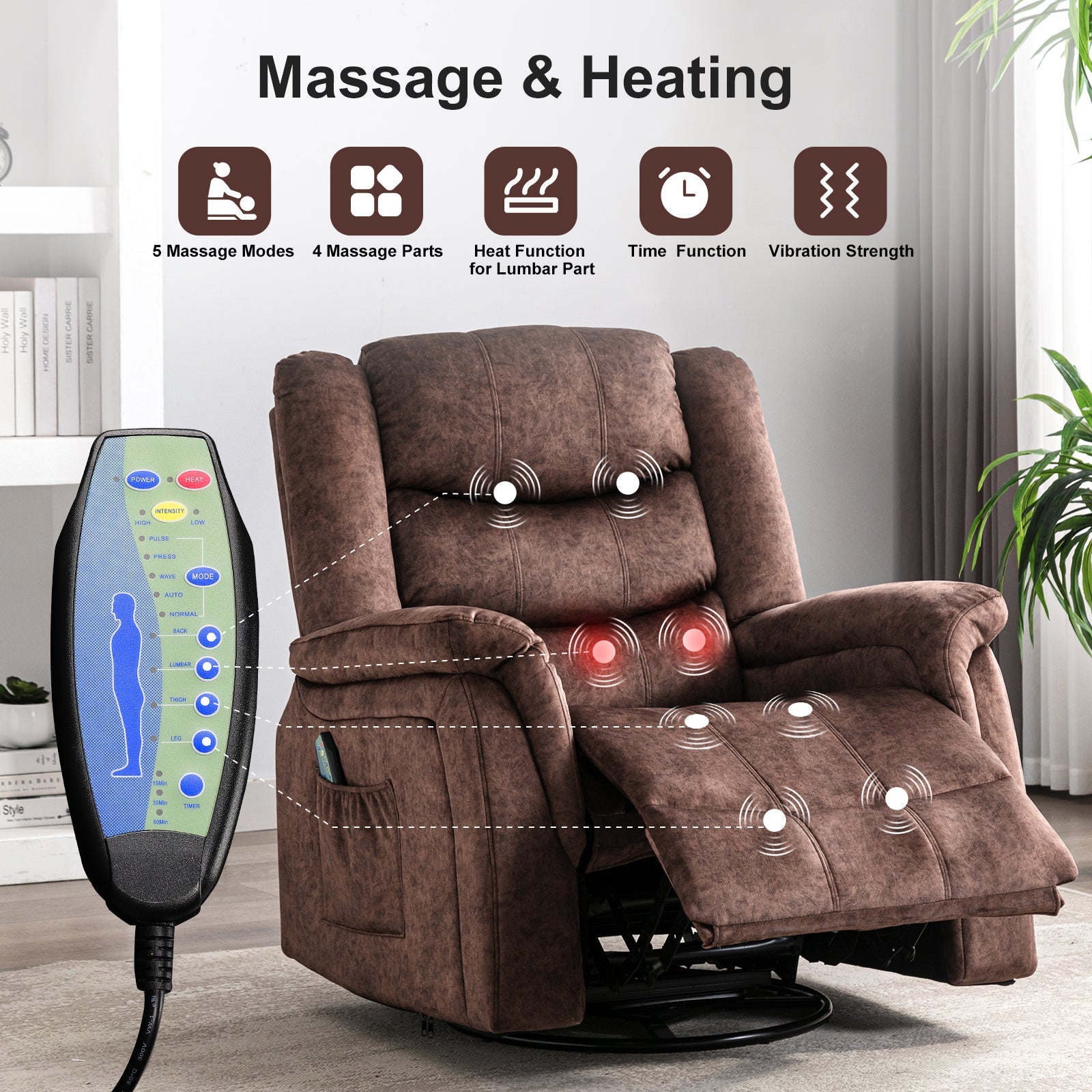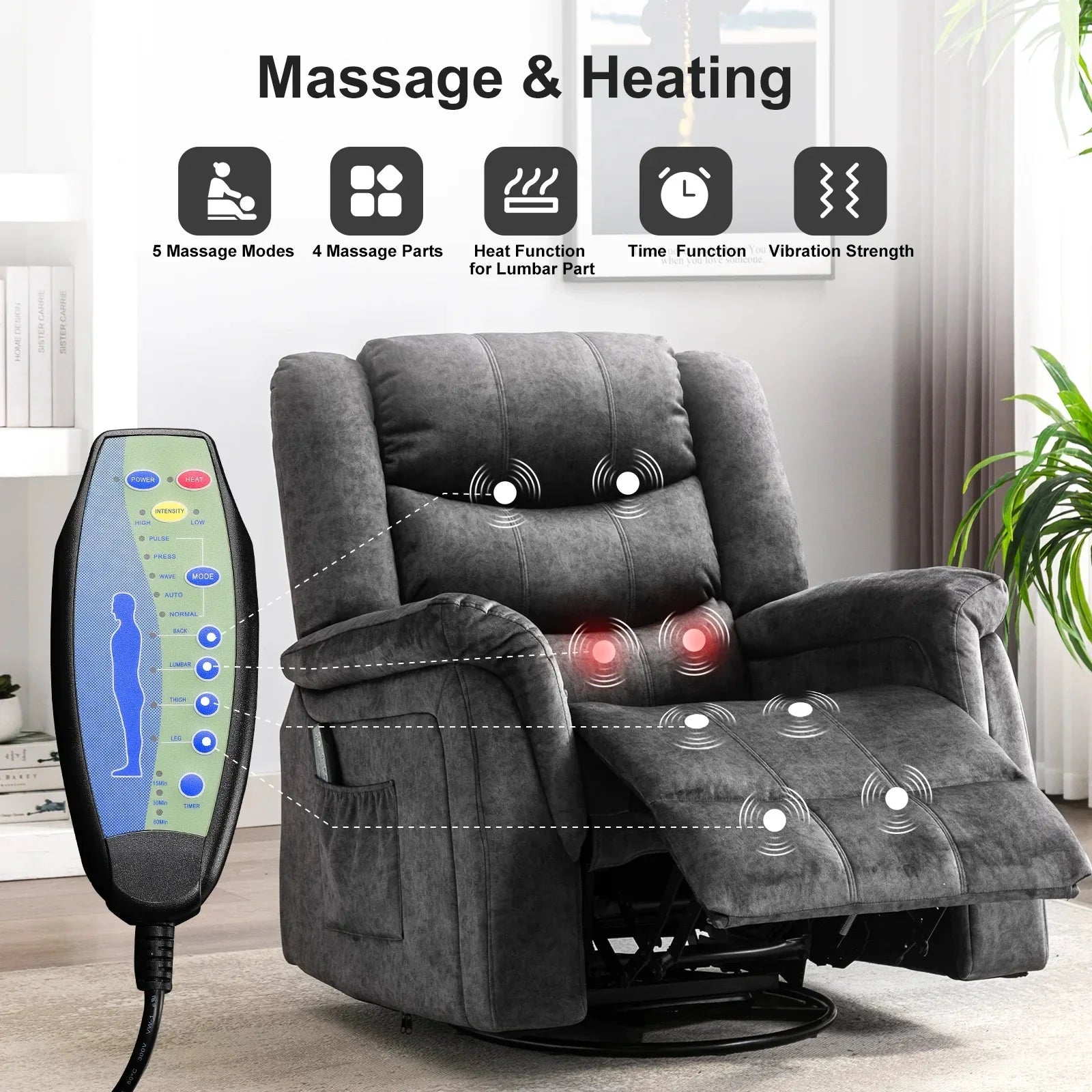 - Massage & Heating: The recliner sofa has 8 vibration points,5 vibration modes, and waist heating function that can help you relieve waist pressure and promote blood circulation. The vibration intensities could be adjustable which offer you the best relaxation.